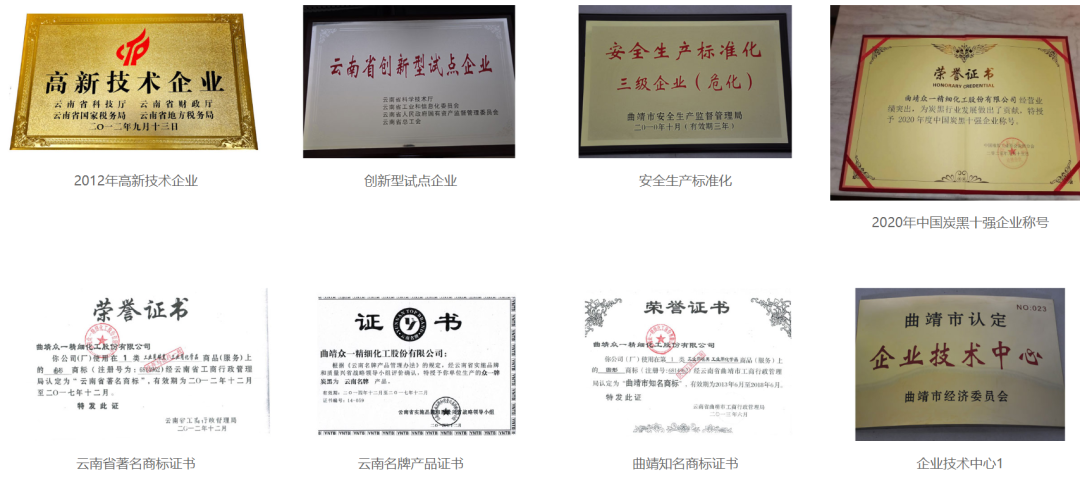 曲靖众一精细化工已通过了质量管理、环境管理、职业健康安全管理三体系认证及ISO/TS16949行业体系认证,先后被授予(认定)为国家高新技术企业、云南省科技计划项目承担单位、云南省企业技术中心、云南省煤焦油工程技术研究中心、云南省创新型试点企业,云南省百户优强民营企业、云南省科技小巨人企业、云南省循环经济示范试点企业、云南省100强企业及曲靖市60户重点骨干工业企业,并连续被当地政府授予“守合同重信用先进企业”、“ 安全生产工作先进集体”等称号。(以下为公司部分荣誉资质展示)。