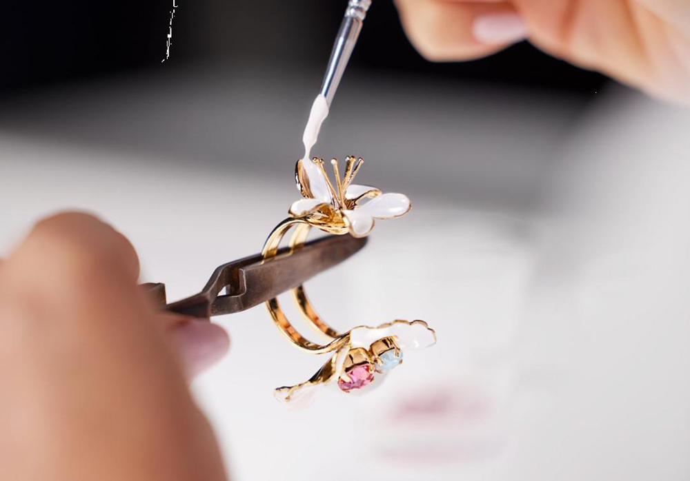 两朵金属花朵历经火烧工艺塑造成形。随后,戒指先经手工打磨抛光,再覆以金箔。在镶嵌白色和玫瑰色水晶后,最后再涂饰精美珐琅。在匠师的妙手点染之下,樱花绽放出绚丽色彩,朵朵栩栩如生。