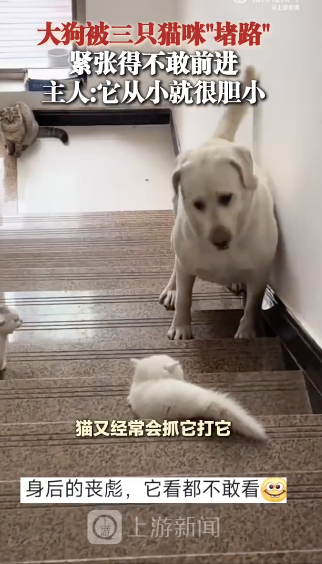 大狗被三只猫咪堵路紧张得不敢前进。7月20日(受访),甘肃,大狗被三只猫咪“堵路”紧张得不敢前进,主人:它从小就很胆小。