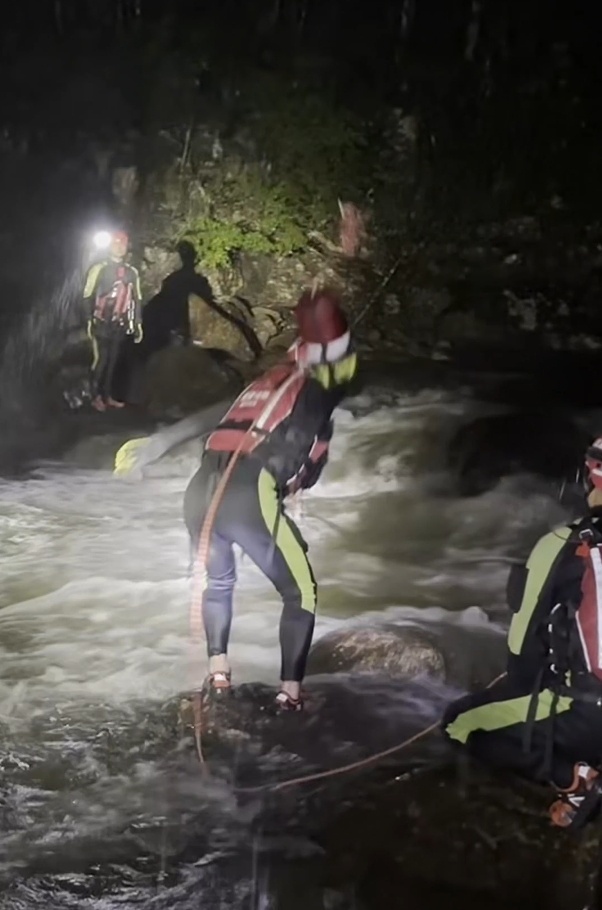 经过近30分钟的搜索,终于在九龙潭上游岸边找到24名被困人员。消防救援人员观察水势后,将绳索固定在岸边树木上,并做好安全措施。随后,他们携带安全绳横渡齐腰深的河水向对岸行进。确认所有人员身体无碍后,消防救援人员将绳包抛向对岸,制作锚点,搭建“渡河扶梯”,利用绳索将24人依次转移到岸边。