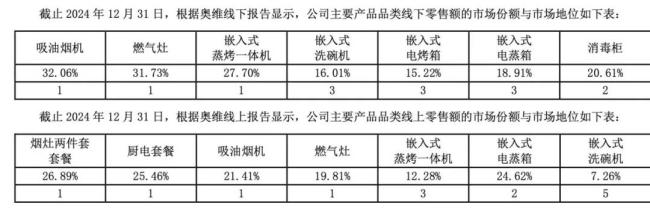 如果从老板电器披露年报看,截至2024年12月31日,奥维线下报告显示,老板电器的吸油烟机、燃气灶、嵌入式蒸烤一体机的线下零售市场份额分别为32.06%、31.73%、27.7%,市场排名第一。奥维线上报告,烟灶两件套套餐、厨电套餐、吸油烟机、燃气灶的线上零售额市场份额分别是26.89%、25.46%、21.41%、18.81%,上述4款产品的市场排名也是第一。