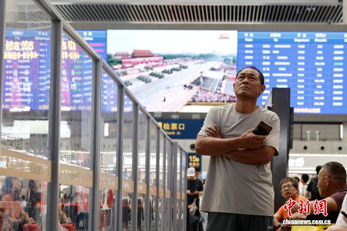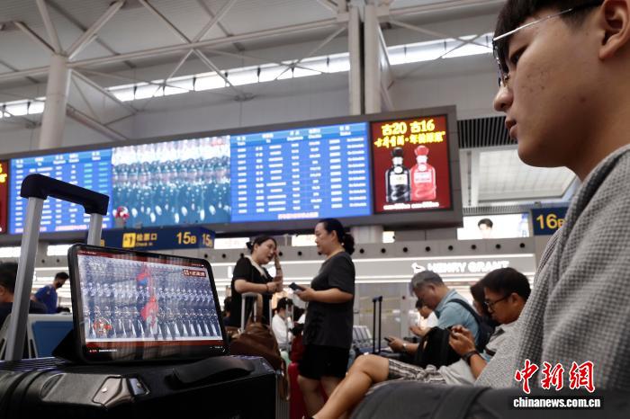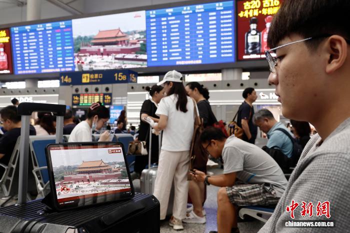 图为在铁路上海虹桥站候车大厅,旅客观看视频直播。中新社记者 殷立勤 摄