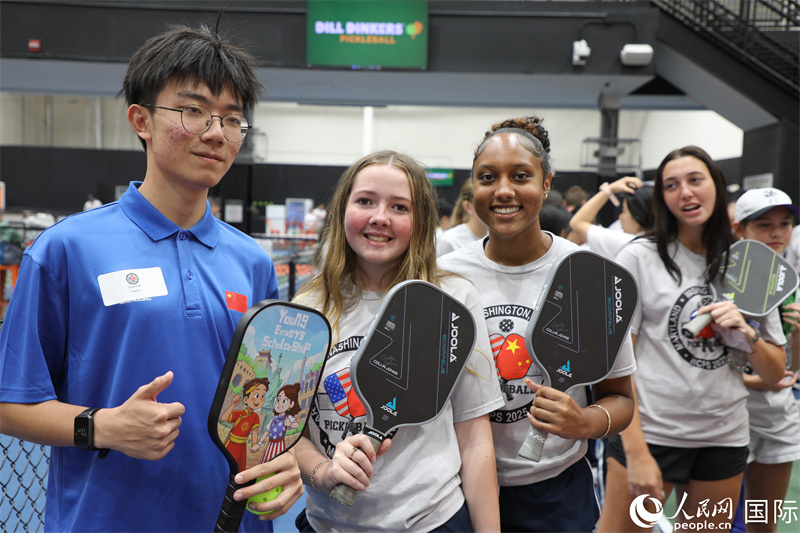此次友谊赛是2025中国青少年匹克球人文交流美国行的系列活动之一。中美青少年混编分组,在匹克球场共赴青春之约、书写友谊新篇。今年4月,马里兰州青少年匹克球交流团成功访华,与中国青少年结下友谊。此次,来自中国深圳的53名师生访问美国,与美国青少年展开交流活动。