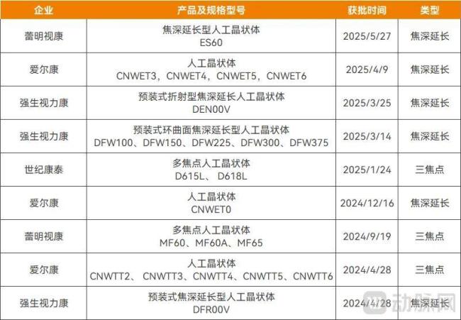 2025年以来,国内三焦点、焦深延长(EDOF)等屈光性人工晶体获批数量激增,爱尔康、强生视力康等跨国巨头,以及蕾明视康、世纪康泰等国内企业加速布局;集采又推动了行业升级迭代,促使这类高端晶体可及性提升。