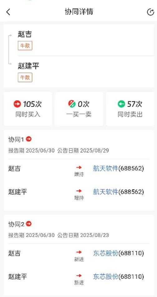 此外,赵建平与赵吉,常常现身同家公司的前十大流通股东。看究竟数据显示,两人协同操作达162次,包括105次同时买入和57次同时卖出。从早前的贵研铂业、佛慈制药、酒鬼酒,到近年操作的国科微、海马汽车、高华科技等,二人步调高度一致。