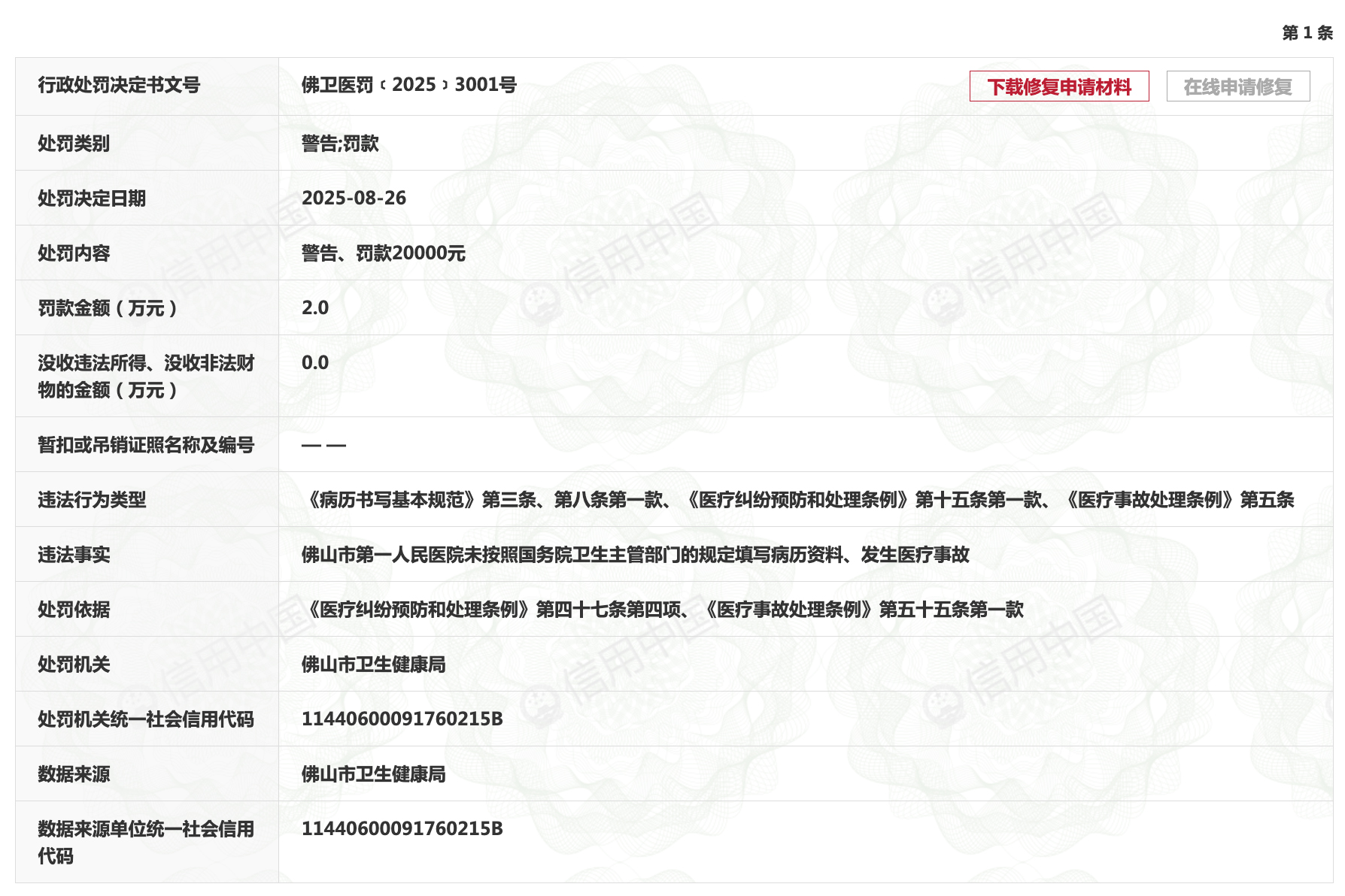 信用中国网站显示,近日,佛山市第一人民医院,因未按照国务院卫生主管部门的规定填写病历资料、发生医疗事故,被佛山市卫生健康局警告、罚款20000元。
