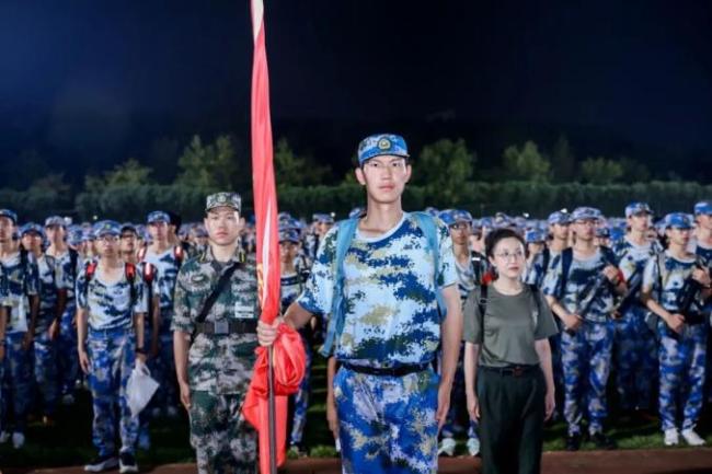 整装待发时,同学们迅速到位,整理行装、清点人数,在东田径场和艺博馆南门整齐列队,等待出发指令。随着“出发!”的命令响起,同学们挺胸阔步,昂首前进。星光点缀迷彩服,灯火映照征途,少年意气在夜色中闪耀。每一步都踏响青春的节拍,战歌阵阵振人心,军号声声唤征途。同学们并肩携手,矢志向前,不惧疲惫,不减豪情。行军途中的补给点、鼓动点为同学们送上温暖的鼓励和提气的呐喊。在指定合影点位前,同学们并肩而立,定格军训点滴,珍藏奋进荣光。