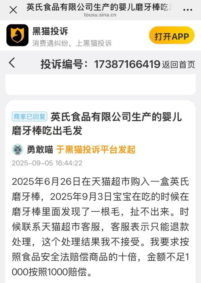 胡说有理注意到,黑猫投诉显示,截至9月5日,共有400多条投诉中包含搜索词“英氏”。