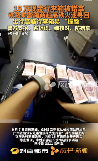 长沙一旅客15万现金行李箱被错拿。长沙一旅客15万现金行李箱被错拿,铁路警方急速寻回。9月7日返校高峰,朱先生在G565次列车上报警称装有15万元现金的行李箱丢失。警方排查发现,李姓旅客在长沙南站误拿行李箱并换乘G811次列车。铁路警方迅速联动,借助12306信息锁定位置并找到李先生。经核实为误拿,现金完好。最终行李箱被送回,双方换回行李。