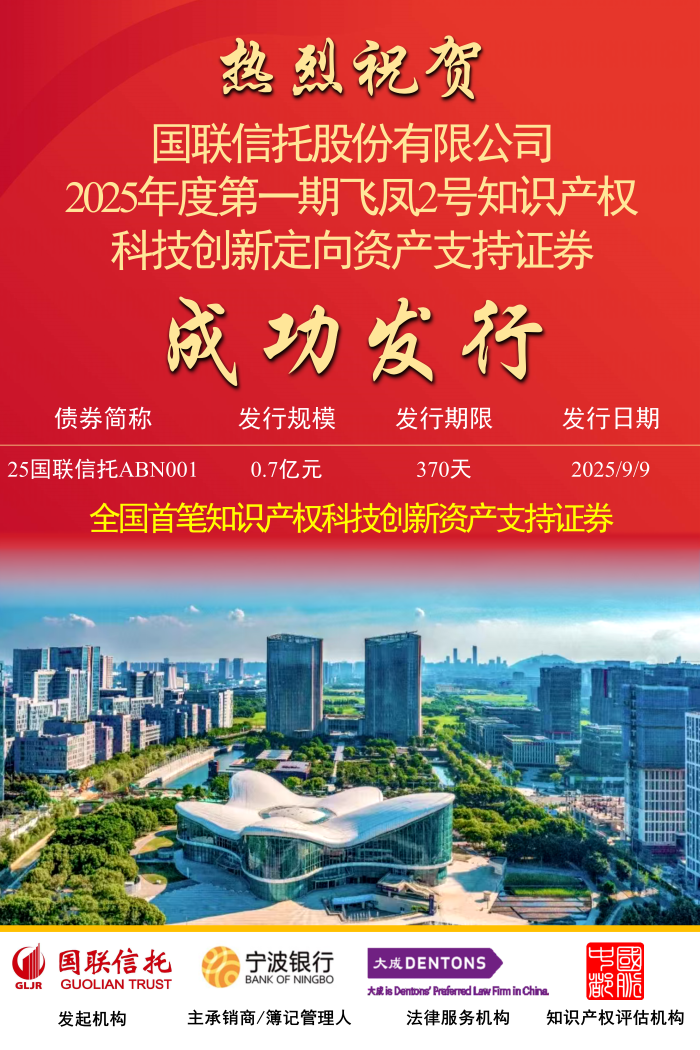 9月10日,由宁波银行独立主承销的“国联信托股份有限公司2025年度第一期飞凤2号知识产权科技创新定向资产支持证券”成功缴款起息,发行金额0.7亿元,期限370天。本期资产支持证券从启动注册到首期发行历经一年半有余,最终在各级监管部门和银行间市场交易商协会倾情指导下、在无锡高新区管委会和无锡市市场监管局全力支持下成功落地,是全国首笔知识产权科技创新资产支持证券。
