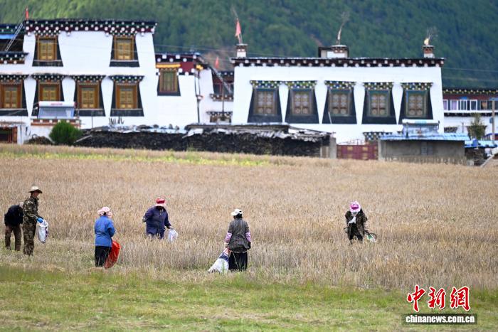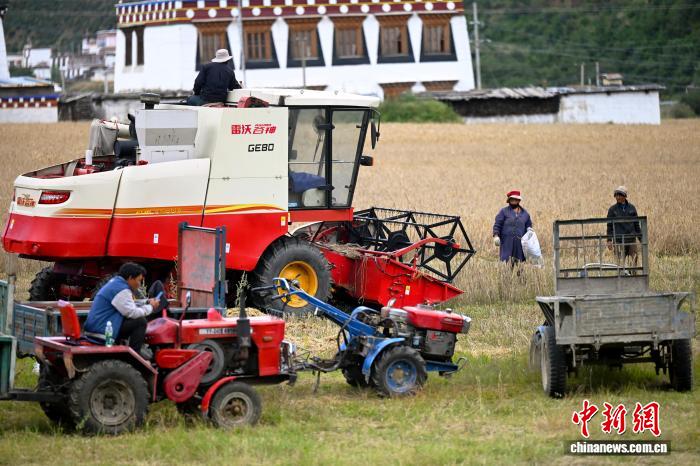 9月14日,四川省甘孜州乡城县热打坝机器轰鸣,村民忙着收割青稞。9月中旬开始,乡城县各地的青稞陆续迎来丰收时节。中新社记者 张浪 摄
