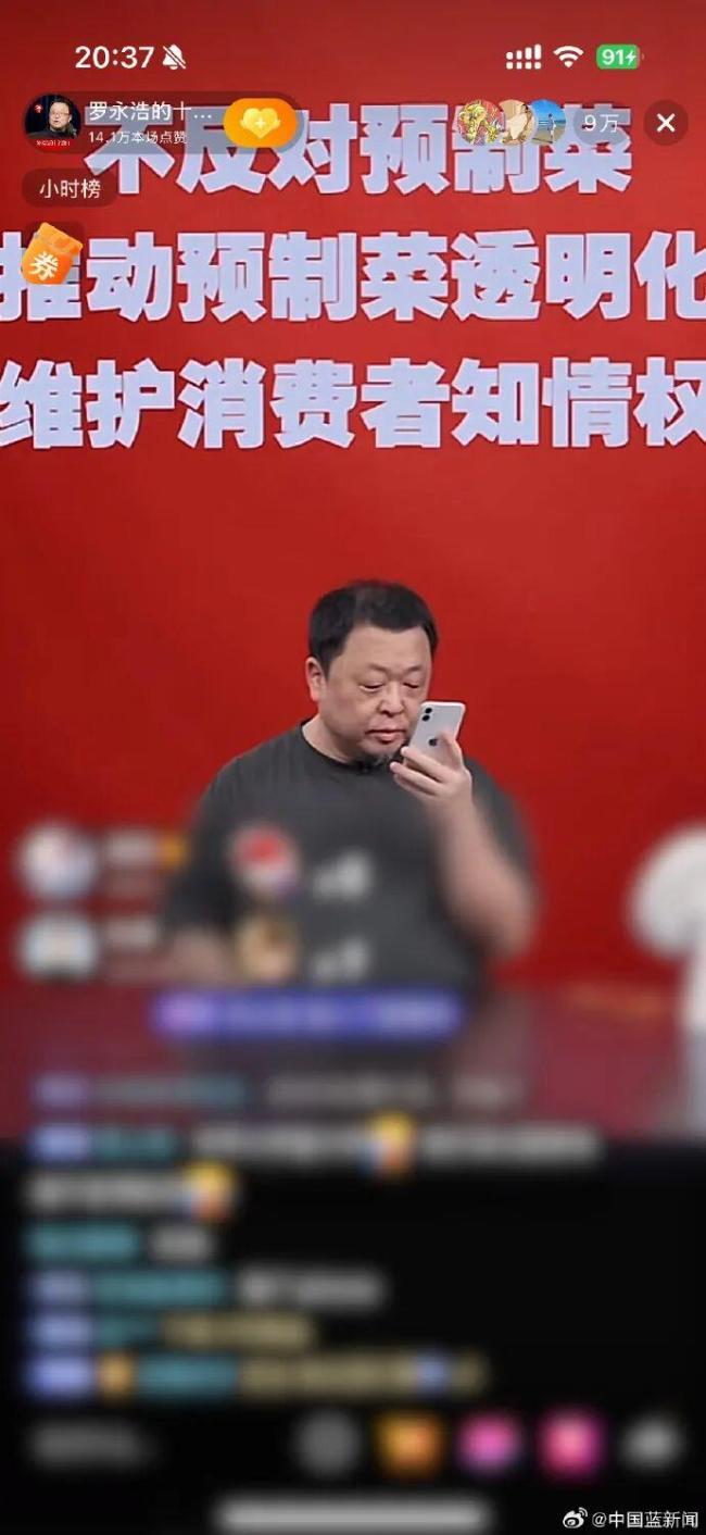 9月12日晚,罗永浩在社交媒体上直播讨论了西贝事件。背景大屏上写着“不反对预制菜 推动预制菜透明化 维护消费者知情权”。