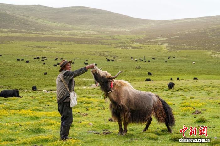图为牧民给牦牛喂食。白依乡农民专业合作社 供图