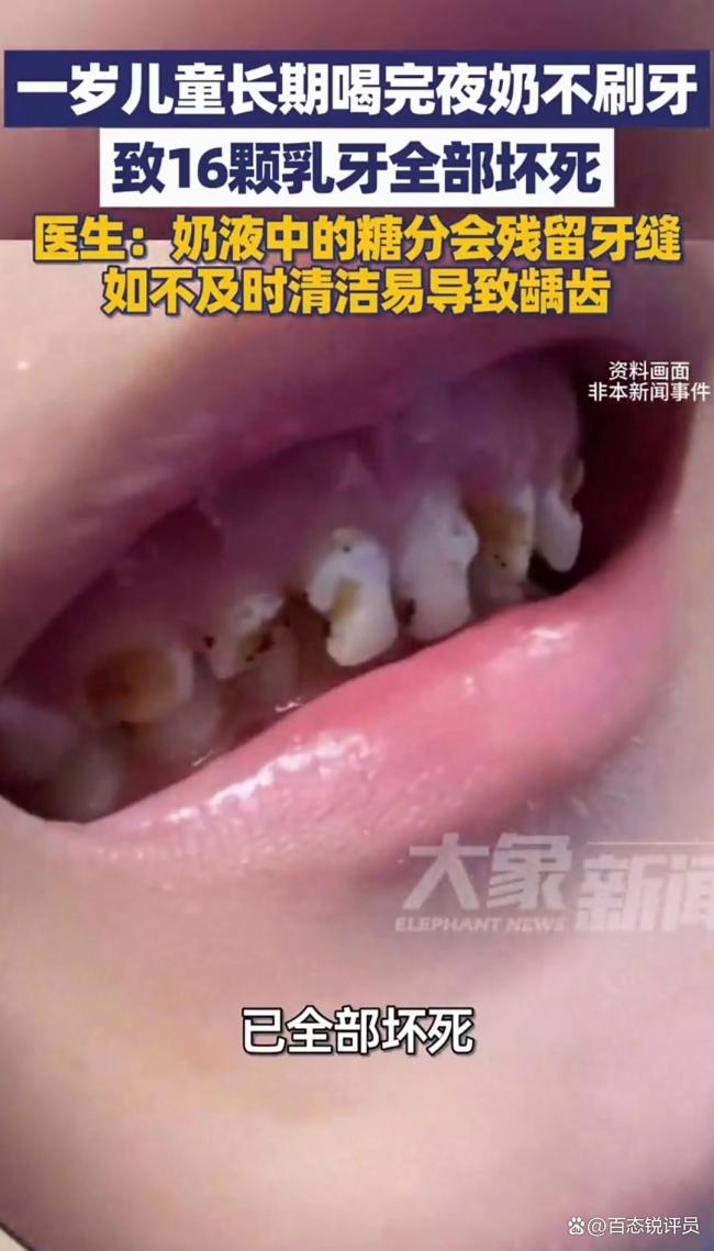 近日,杭州一名一岁多的儿童小乖因长期喝夜奶且不刷牙,导致已长出的16颗乳牙全部坏死,引发社会关注。据孩子家长介绍,小乖每次喝完夜奶后便安然入睡,他们因此忽略了喝完夜奶后需清洁口腔这一关键环节。