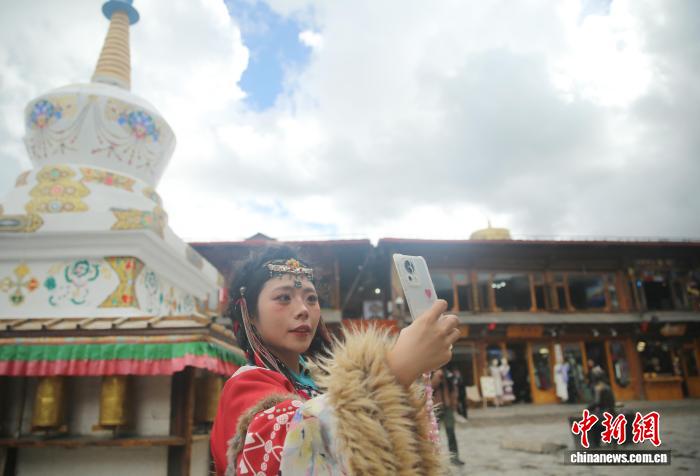 9月27日,一名身穿藏族服装的游客在香格里拉独克宗古城打卡。黄兴鸿 摄