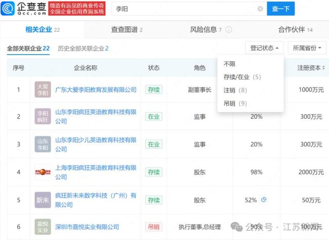 企查查APP显示,李阳名下关联22家企业,其中17家已注吊销,仅5家处于存续状态,包括广东大爱李阳教育发展有限公司、山东李阳疯狂英语教育科技有限公司等,他在这些公司担任副董事长、监事等职务。