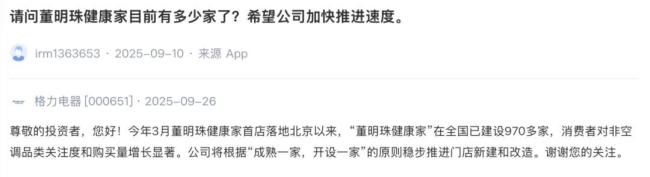 半年狂飙近千家,备受争议的“董明珠健康家”搞咋样了? 多元化转型加速!格力电器正在加速推进其“董明珠健康家”项目。尽管这一举措曾引发争议,但公司并未停止脚步。近日,格力电器在投资者互动平台上透露,自今年3月首店落地北京以来,“董明珠健康家”已在全国部署了970多家门店。