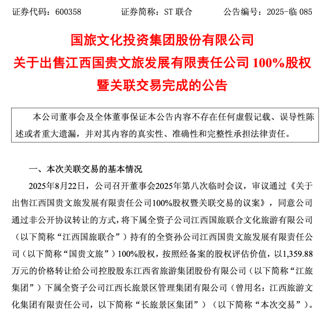 10月10日,ST联合发布关于出售江西国贵文旅发展有限责任公司100%股权暨关联交易完成的公告,通过非公开协议转让的方式,将下属全资子公司江西国旅联合文化旅游有限公司持有的全资孙公司江西国贵文旅发展有限责任公司100%股权,按照经备案的股权评估价值,以1359.88万元的价格转让给公司控股股东江西省旅游集团股份有限公司下属全资子公司江西长旅景区管理集团有限公司,并且已经完成了公司变更,至此,ST联合成功剥离了江西国贵文旅发展有限责任公司。