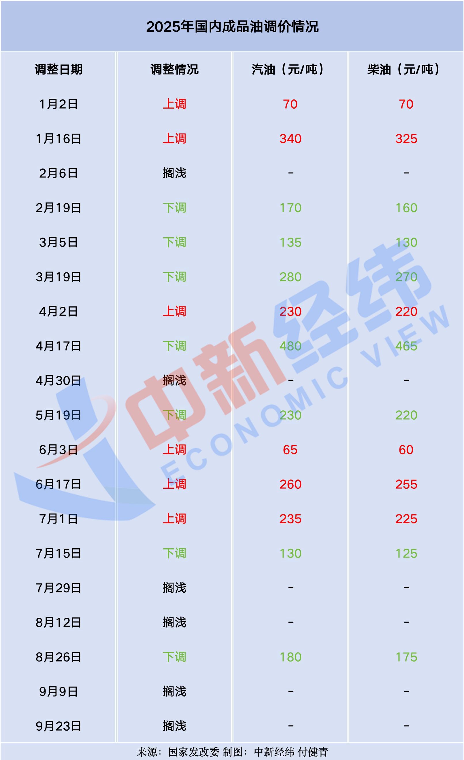 中新经纬梳理发现,国内油价已经历十九轮调整,呈现“六涨七跌六搁浅”的格局,国内汽、柴油价格较去年底分别下跌405元/吨和390元/吨。