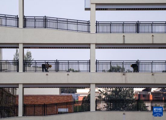 9月29日,在卢旺达基加利市郊的马萨卡医院改扩建项目建筑工地上,两名工人在忙碌。新华社记者 李亚辉 摄