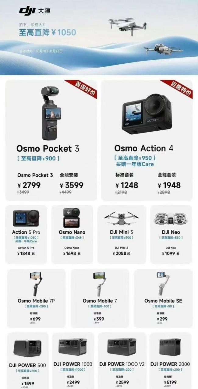 此前,大疆品牌宣布多款产品降价,最高优惠达1478元。这一消息引起了广泛关注,“大疆部分产品降价超千元”等话题登上微博热搜。此次降价涉及云台相机、运动相机、航拍器等多种产品。