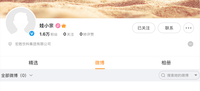 目前,“娃小宗”已经开通了官方微博,主体为“宏盛饮料集团有限公司”,虽然目前该微博尚未发布内容,但短短几天,粉丝已经达到了1.6万。