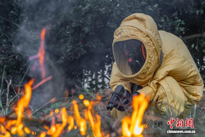 图为防化分队官兵正在对“染毒”地带进行毒剂侦检。何家龙 摄