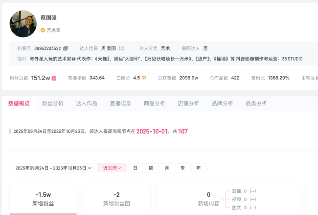 从喜马拉雅烟花秀事件至今,已过去一个多月,蔡国强社交媒体持续掉粉。灰豚数据显示,蔡国强抖音近30日掉粉超1.5万,截至发稿,其粉丝数为151万。