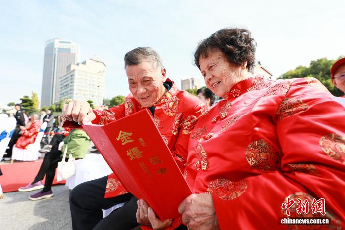 10月29日,正值重阳节,江西南昌滕王阁旅游区举办第八届金婚盛典活动,50对金婚夫妇齐聚滕王阁下,共度重阳佳节并庆祝金婚仪式。图为身着红色喜服的金婚夫妇正在观看金婚证书。中新社记者 刘思伟 摄