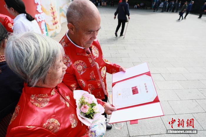 10月29日,正值重阳节,江西南昌滕王阁旅游区举办第八届金婚盛典活动,50对金婚夫妇齐聚滕王阁下,共度重阳佳节并庆祝金婚仪式。图为一对金婚老人,正在展示他们的金婚证书。中新社记者 刘思伟 摄