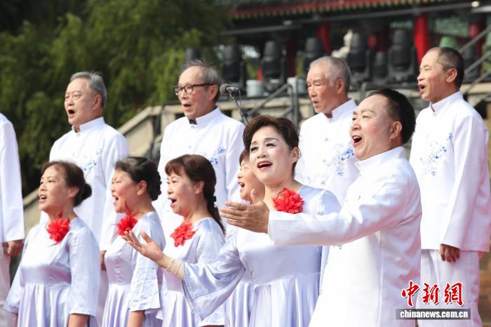 10月29日,正值重阳节,江西南昌滕王阁旅游区举办第八届金婚盛典活动,50对金婚夫妇齐聚滕王阁下,共度重阳佳节并庆祝金婚仪式。图为老年合唱团正在演唱《夕阳红》。中新社记者 刘思伟 摄