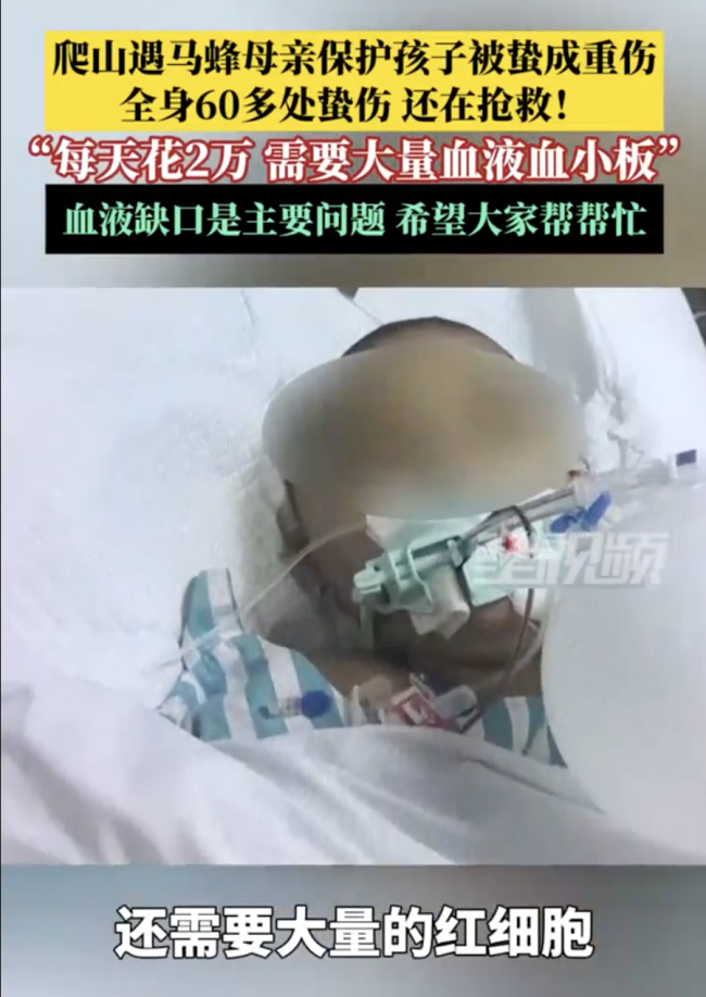 妈妈为保护儿子被马蜂蛰60多针。近日,重庆,彭先生一家去爬山遇马蜂,妻子谭小丽为保护9岁儿子被蛰成重伤陷入昏迷,还在重症监护室抢救。因为病情危重,随时有生命危险,谭小丽需要大量血浆置换治疗,用血需求大。彭先生向广大市民求助,有爱心人士愿意献血的可与他联系。