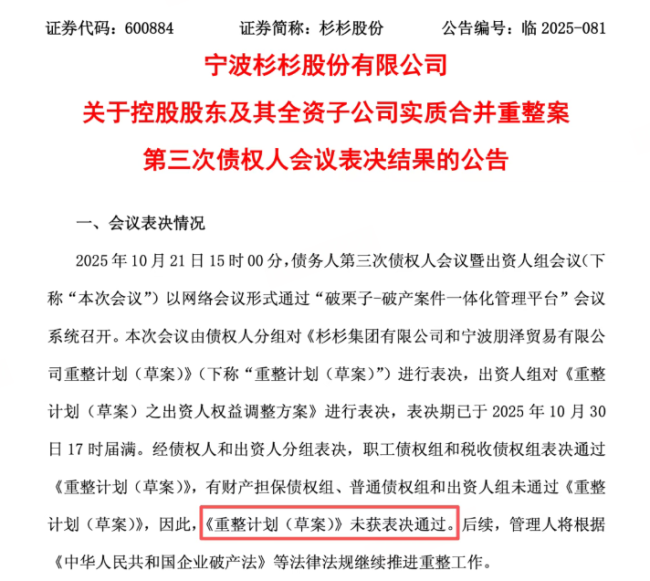 决定杉杉集团前途命运的债权人会议尘埃落定,结果是,重整方案未获表决通过。