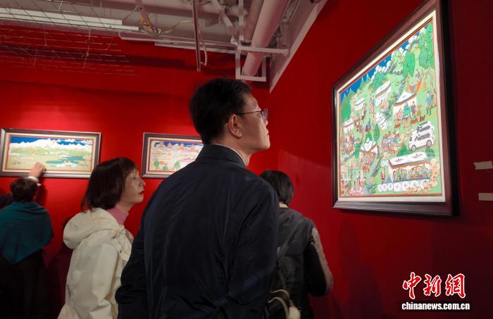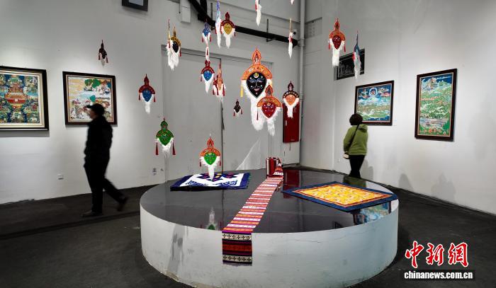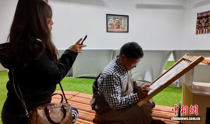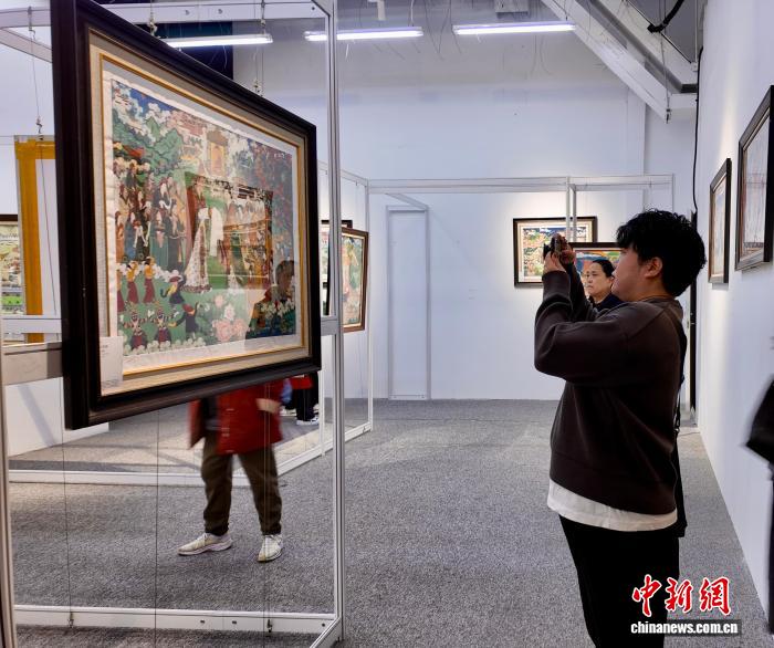 图为参观者拍摄展览现场绘制唐卡的画师。何美锟 摄