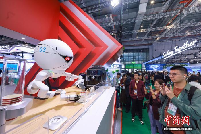 11月8日,在上海举行的第八届进博会服务贸易展区内,机器人制作咖啡。中新社记者 贾天勇 摄
