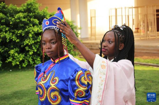 11月8日,在贝宁经济首都科托努举行的“中国贝宁服装秀”活动中,阿波美卡拉维大学孔子学院学生在穿戴中国传统服饰。新华社发(塞拉芬摄)