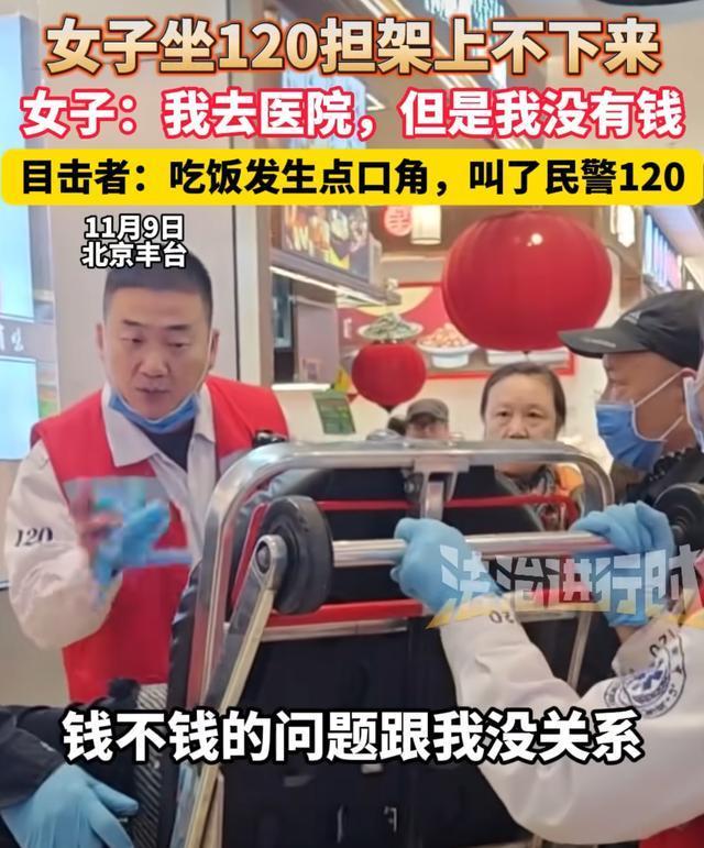 女子与他人发生口角霸座120担架 因没钱拒不下担架!11月9日,在北京的一家餐馆里,一名女子因琐事与其他顾客发生争执。她坐在120担架上拒绝下来,无论工作人员如何劝说,她都坚持说:“我去医院,但是我没钱。”最终,120工作人员告知她的行为已经妨碍了秩序,女子这才从担架上下来。