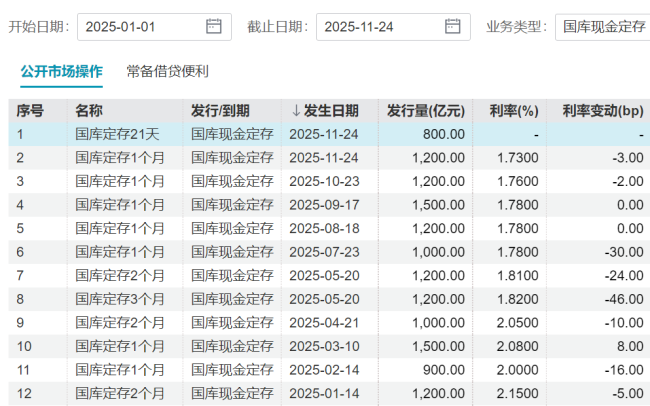 第十一期中标总量为1200亿元,期限为1个月,起息日为2025年11月24日,到期日为2025年12月22日,中标利率为1.73%,较上次下降了3个基点。第十二期中标总量为800亿元,期限为21天,起息日同样为2025年11月24日,到期日为2025年12月15日。