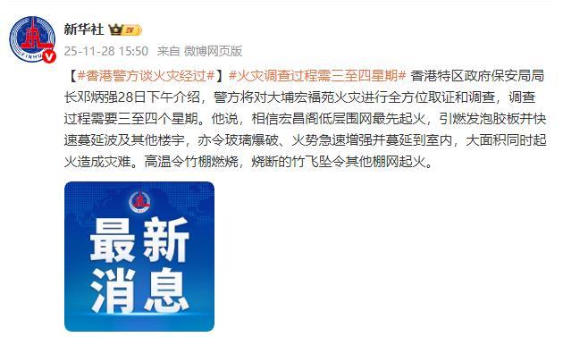 香港特区政府保安局局长邓炳强28日下午介绍了大埔宏福苑火灾的情况。他表示,警方将对火灾进行全面取证和调查,预计调查过程需要三至四个星期。据邓炳强介绍,初步判断火灾起因是宏昌阁低层围网最先起火,随后引燃了发泡胶板并迅速蔓延到其他楼宇。火势还导致玻璃爆破,进一步加速了火势的蔓延,并在室内大面积同时起火,造成了灾难性的后果。高温使竹棚燃烧,烧断的竹子坠落引发更多棚网起火。