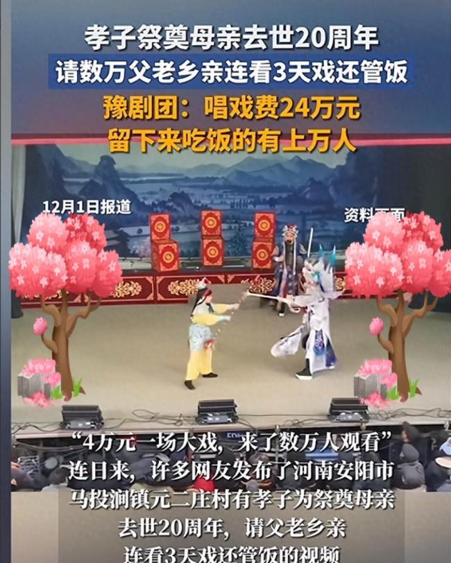 孝子祭奠母亲去世20周年请人看戏 真孝还是显摆?。孝顺是中华民族的传统美德。作为子女,如何表达对父母的爱与尊敬呢?最近,河南安阳市马投涧镇元二庄村的一位男子为祭奠去世20周年的母亲,请乡亲们免费看戏吃饭,这一举动引发了广泛讨论。