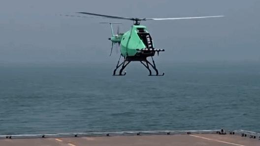 旋戈-500CJ舰载无人直升机是一种绿色的直升机,其机腹下方装有一个类似“鱼叉”的装置,在着舰时与舰船甲板上的格栅紧密相连,确保直升机稳定地停放在甲板上。这款直升机已经完成了自主着舰模拟试验,并在实际海上测试中证明了它在4到5级海况下能够自主起降。此外,它还能够执行侦察和空中落点拍摄等任务。该直升机能够搭载多种模块化载荷,如执行搜索、侦察以及通信中继任务,同时还能与有人驾驶飞机及系列化舰船实现互联互通,成为空中信息化节点,融入整体网络系统。
