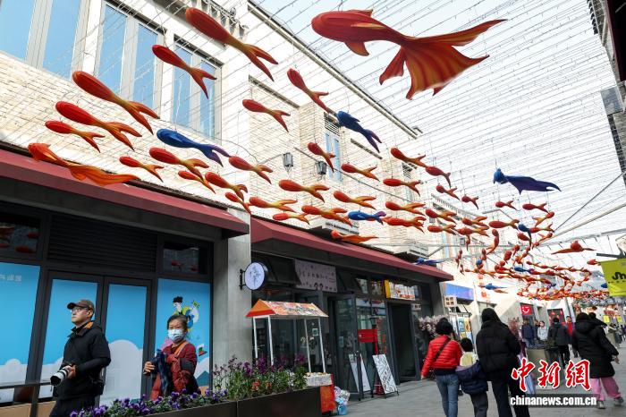2月12日,湖北武汉,春节将至,武昌古城斗级营街区张灯结彩,处处洋溢着喜庆祥和的节日氛围。街区精心打造“抬头见黄鹤楼”的特色打卡场景,还可与武汉长江大桥同框,吸引大批市民游客前来打卡游玩。图为游客在武昌斗级营街区游玩与鱼灯合影。中新社记者 张畅 摄