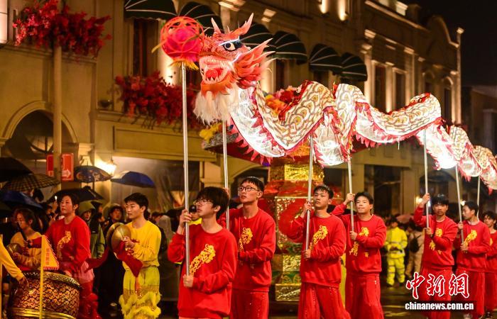 图为3月3日晚,江西赣州章贡区,巡游队伍在表演。胡江涛 摄