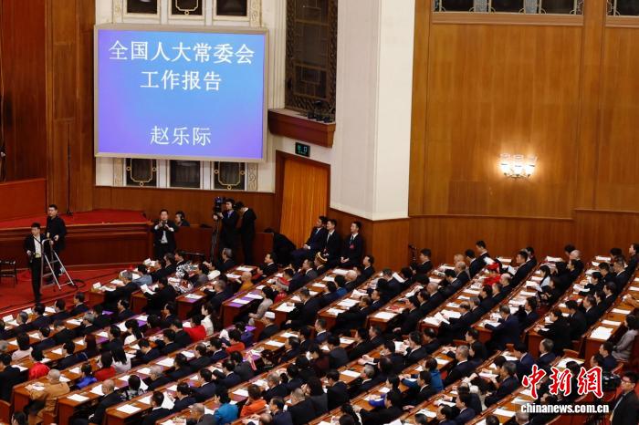 3月9日,十四届全国人大四次会议在北京人民大会堂举行第二次全体会议。全国人大常委会工作报告当日提请审议。中新社记者 韩海丹 摄
