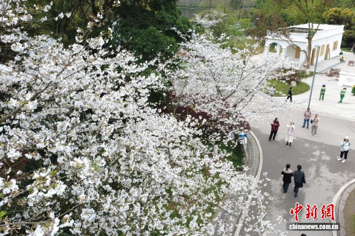 图为游客在重庆园博园赏花拍照。(无人机照片)中新社记者 肖江川 摄
