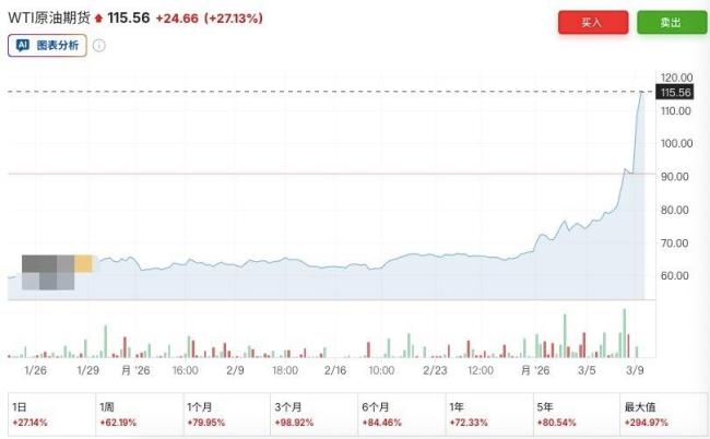 3月9日,国际油价开盘后大幅上涨,自2022年2月以来首次突破100美元/桶,这也是历史上第四次。截至发稿时,WTI原油期货涨超27%,突破115美元/桶;布伦特原油期货涨超25%至116美元/桶。