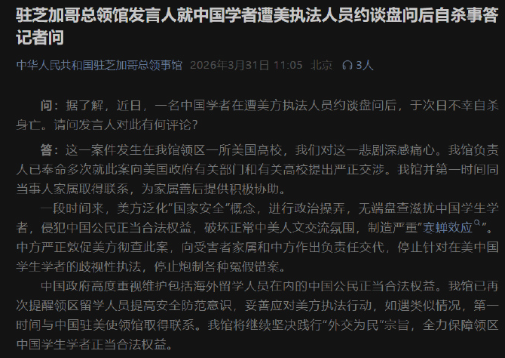 3月31日中午,中华人民共和国驻芝加哥总领事馆发布公众号,回应近期中国学者遭美执法人员约谈盘问后自杀事。