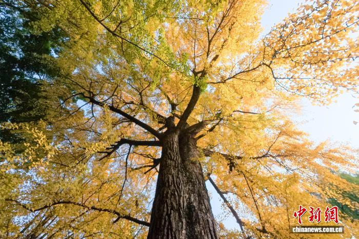 11月24日,初冬暖阳下,四川省眉山市东坡区纱縠行南街的三苏祠博物馆南门内,高大的银杏树渐染金黄,金黄叶片随风轻舞,吸引不少游客驻足观赏、拍照留念,现场洋溢着浓浓的诗意与雅致氛围。图为三苏祠内上百年的古银
