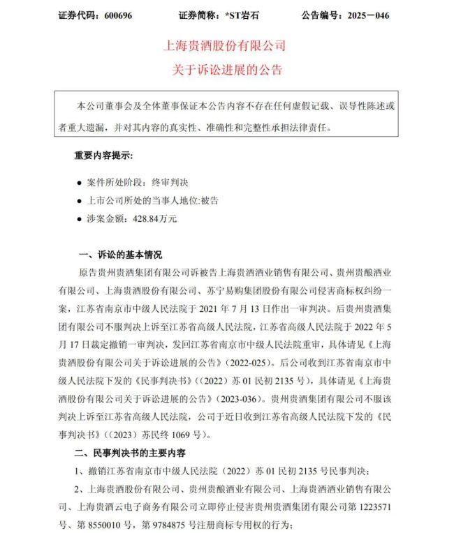 近日,上海贵酒(股票简称:*ST岩石)发布公告。