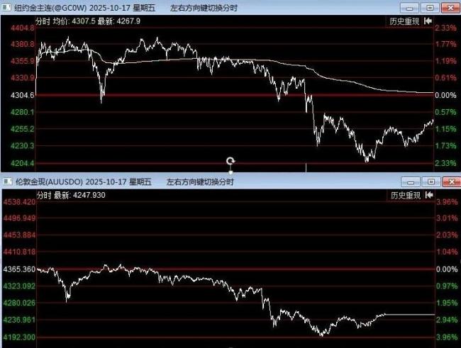 上周五夜盘,贵金属市场经历了显著波动。17日COMEX黄金白盘一度刷新历史新高至4392美元/盎司,但夜盘迅速跳水跌超2%,最低下探至4229.7美元/盎司,振幅高达4.55%;与此同时,伦敦金当日收跌2.69%,一度失守4200美元